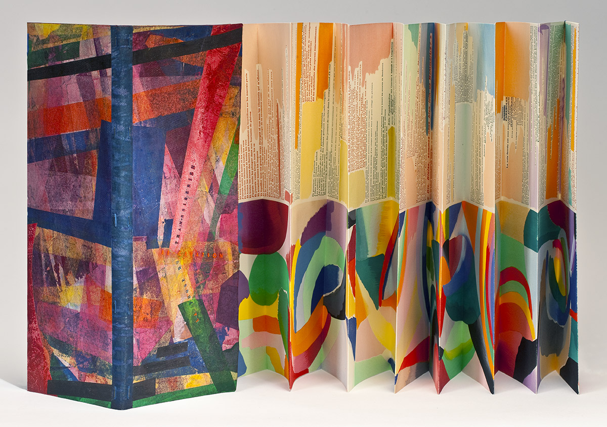 The 1913 book was printed on four large sheets of paper, trimmed, glued into a scroll, then folded in half vertically and folded again into an accordion-fold book. The original binding was a piece of vellum, painted in oils, folded in half, which was to be glued to the top edge of the book. The Paul Bonet binding folded the pages differently from the original; he received the pages unglued, so he decided not to fold the pages in half first; then he folded them into an accordion book. The newly commissioned binders were free to glue and fold the book as they wished, though a few binders were given the book already glued and folded by the original method.